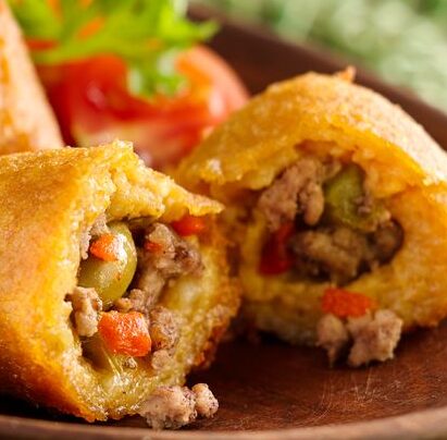 1 fritters made from green bananas and taro, filled with savory groundbeef
