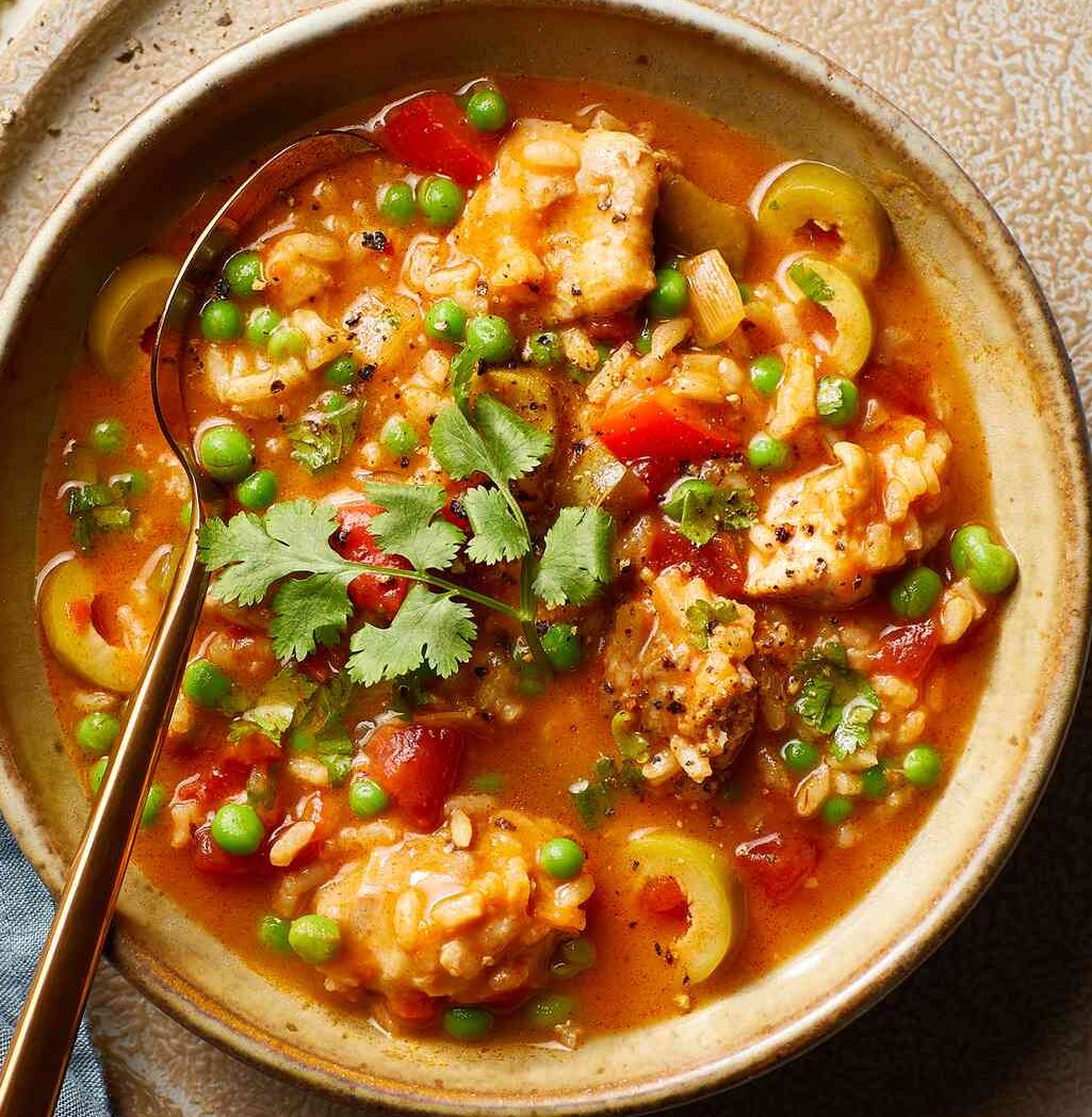 Puerto Rican chicken and rice soup seasoned with tomatoes, peppers, andspices.