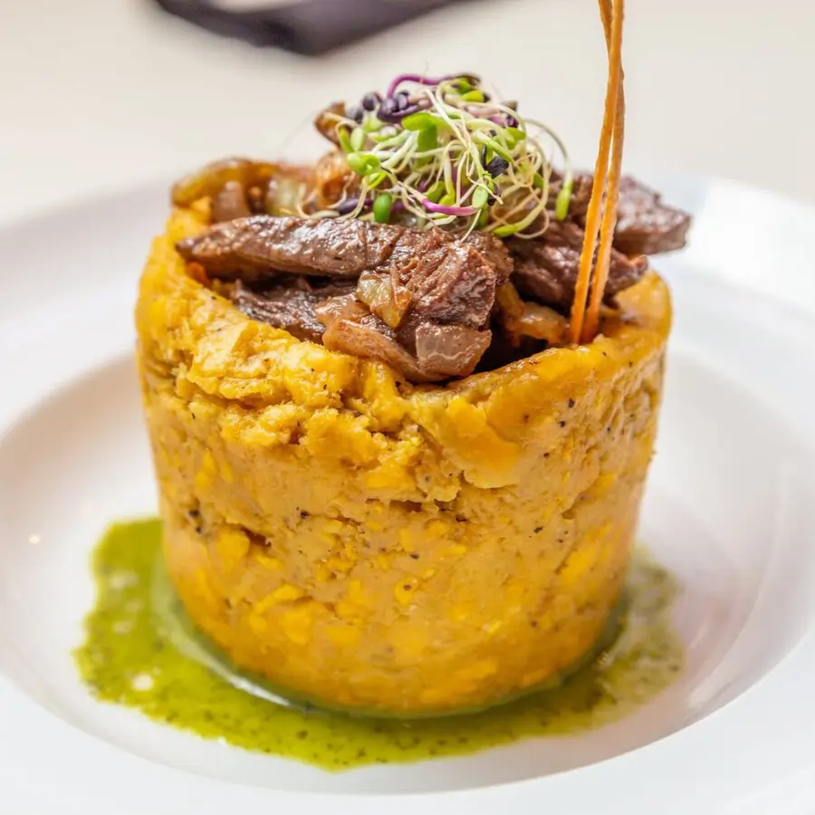 Mashed green plantains with garlic and pork cracklings, topped with sautéed