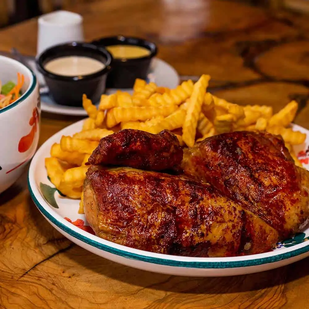 Colombian rotisserie chicken marinated in spices, served with potatoes and salad
